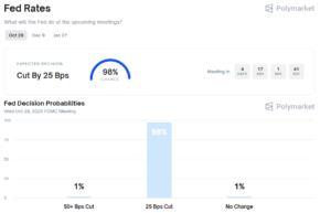 El primero es la reunión de la Reserva Federal del 29 de octubre. El consenso es casi unánime. El mercado de predicciones Polymarket le asigna un 96% de probabilidad a un recorte de 25 puntos básicos en las tasas de interés, una visión que es respaldada por el 99% de probabilidad que le otorgan los estrategas de JP Morgan.